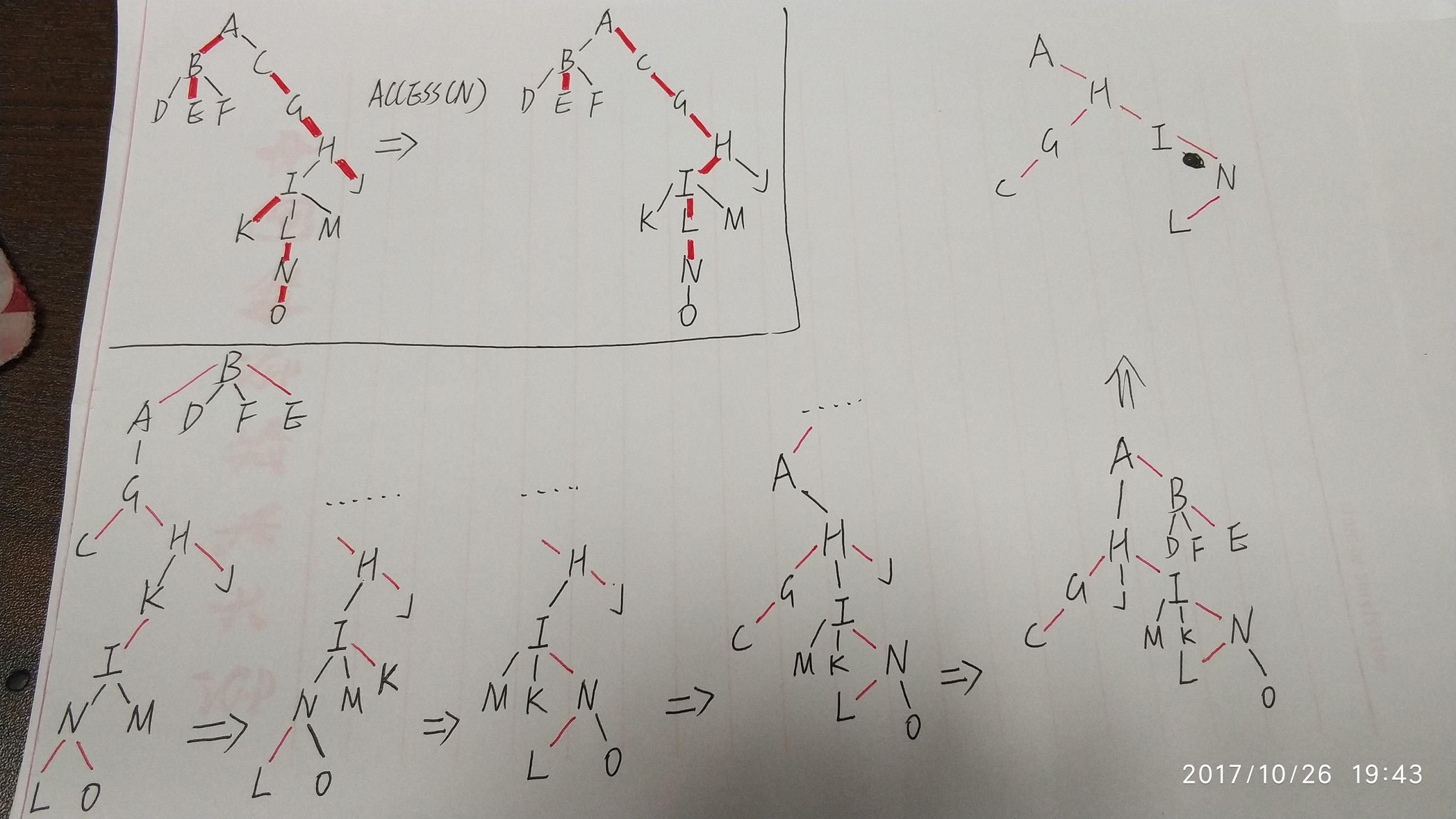 左下角的这棵树就是 Access(N) 操作前的 Splay 森林的结构,红边是 Splay 的树边,黑边是两棵 Splay 树的连接关系。这里其实一共有 7 棵 Splay 树:ABE,D,F,CGHJ,IK,LNO,M。可以看到每一棵 Splay 实际上表示的是一条 Preferred Path 或者单个节点,Preferred Path 在原树中的深度就是对应的 Splay 中节点的索引值(!!这个对理解很重要)。