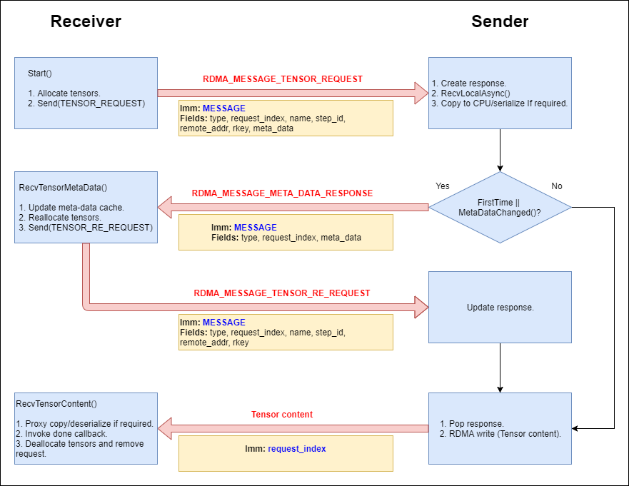 之后发送 RDMA_MESSAGE_TENSOR_REQUEST 消息。消息中包含的内容除了 key 之外,最重要的就是前面准备好的 Tensor 地址和 rkey 了,这个标识了远程的发送端等一下要把数据写到什么地方去。
